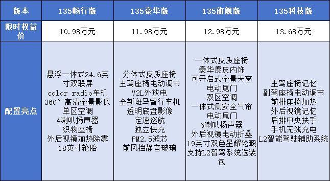其次是135豪華版,限時權(quán)益價11.98萬元,既然是豪華版車型,消費者肯定更看重配置水平,這一版本新增了分體式高級皮質(zhì)座椅、主駕座椅電動調(diào)節(jié)、V2L外放電、全新斑馬智行車機系統(tǒng)、透明底盤影像/540度全息影像、定速巡航等配置,因此出行體驗更加智能便利,駕乘體驗也更加舒適,能夠契合消費者對于豪華版的期待。