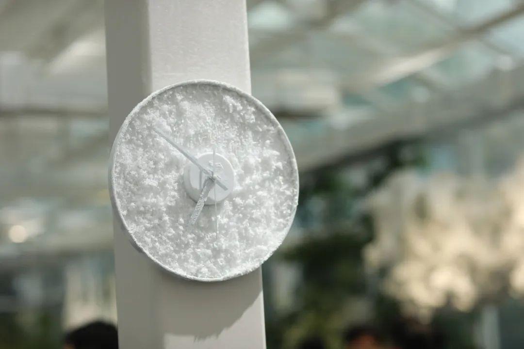 《剪云雕雪》一旁的柱子上有一塊冰雪鐘表,這款裝置名為《雪凝時刻》,意為生命中某些時刻會“凝固”,成為永遠的紀念。
