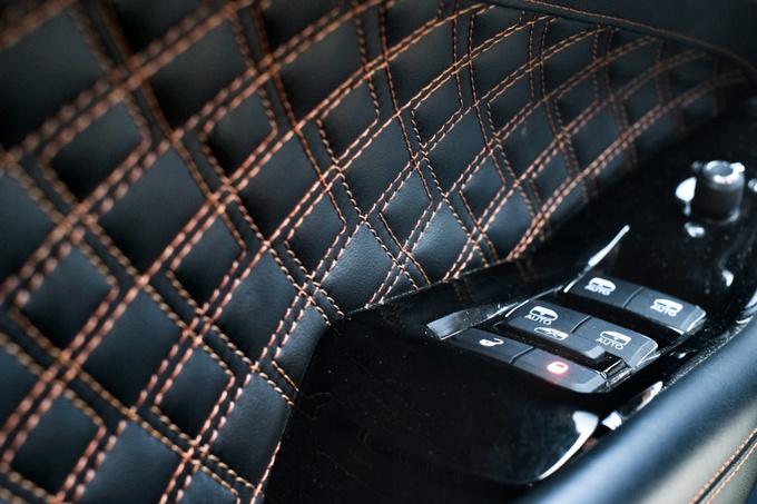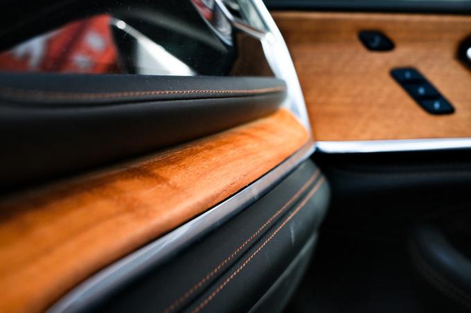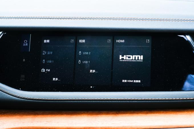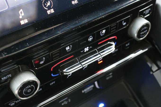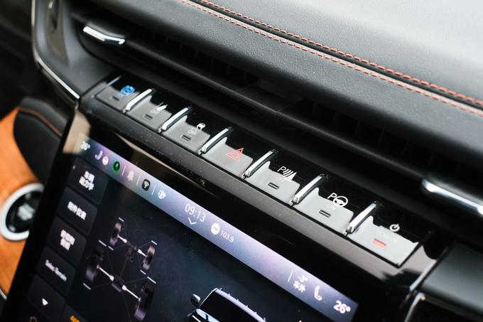 更細節的方面,方向盤、中控臺、門板上能夠看到實木樣式的裝飾面板,與其搭配的是亮黑色的面板和金屬材質的點綴,作為一款指導價格將近75萬的車型來說,這一切都符合它豪華的定位。另外中控臺屏幕的上下分別有實體按鍵的設計,可以控制車輛安全輔助系統和空調的功能,操作起來非常便捷。