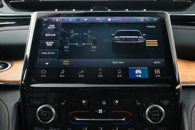 在此之前大家可能很難想象Jeep旗下的車型還能擁有三塊屏幕,全液晶儀表+中控屏幕+副駕駛屏幕均為10英寸,全液晶儀表可以顯示的內容很豐富,亮點在于擁有夜視功能。中控屏幕則擁有4G車聯網功能,只不過小程序豐富程度上還有待提升。而副駕駛屏幕并沒有額外的在線娛樂功能,所以實用性并不高。