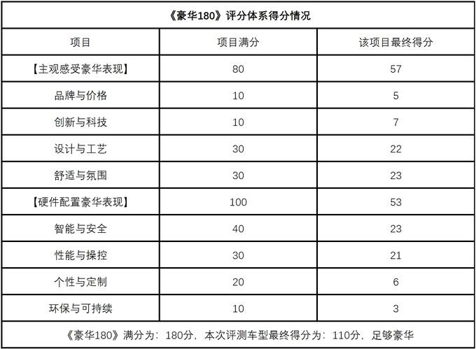 “豪華180”豪華指數評分體系滿分為180分,根據最終得分分為:不夠豪華(90分以下)、入門豪華(90-109分)、足夠豪華(110-129分)、非常豪華(130-159分)、頂級豪華(160-180分)。
