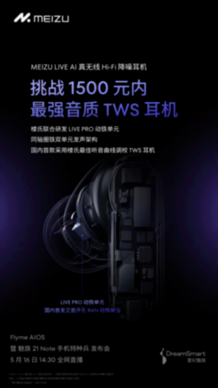 5月16日,魅族舉辦了AI新品發布會,正式發布了魅族21 Note、全新Flyme AIOS和魅族LIVE AI真無線Hi-Fi降噪耳機三大新品。魅族21 Note起售價2599元,LIVE AI真無線耳機售價599元。魅族LIVE AI搭載了與樓氏聯合研發的LIVE PRO動鐵單元和索尼半導體旗艦級專業降噪芯?,采用樓氏最佳聽音曲線調教,支持獨立空間音頻和三麥通話降噪功能。