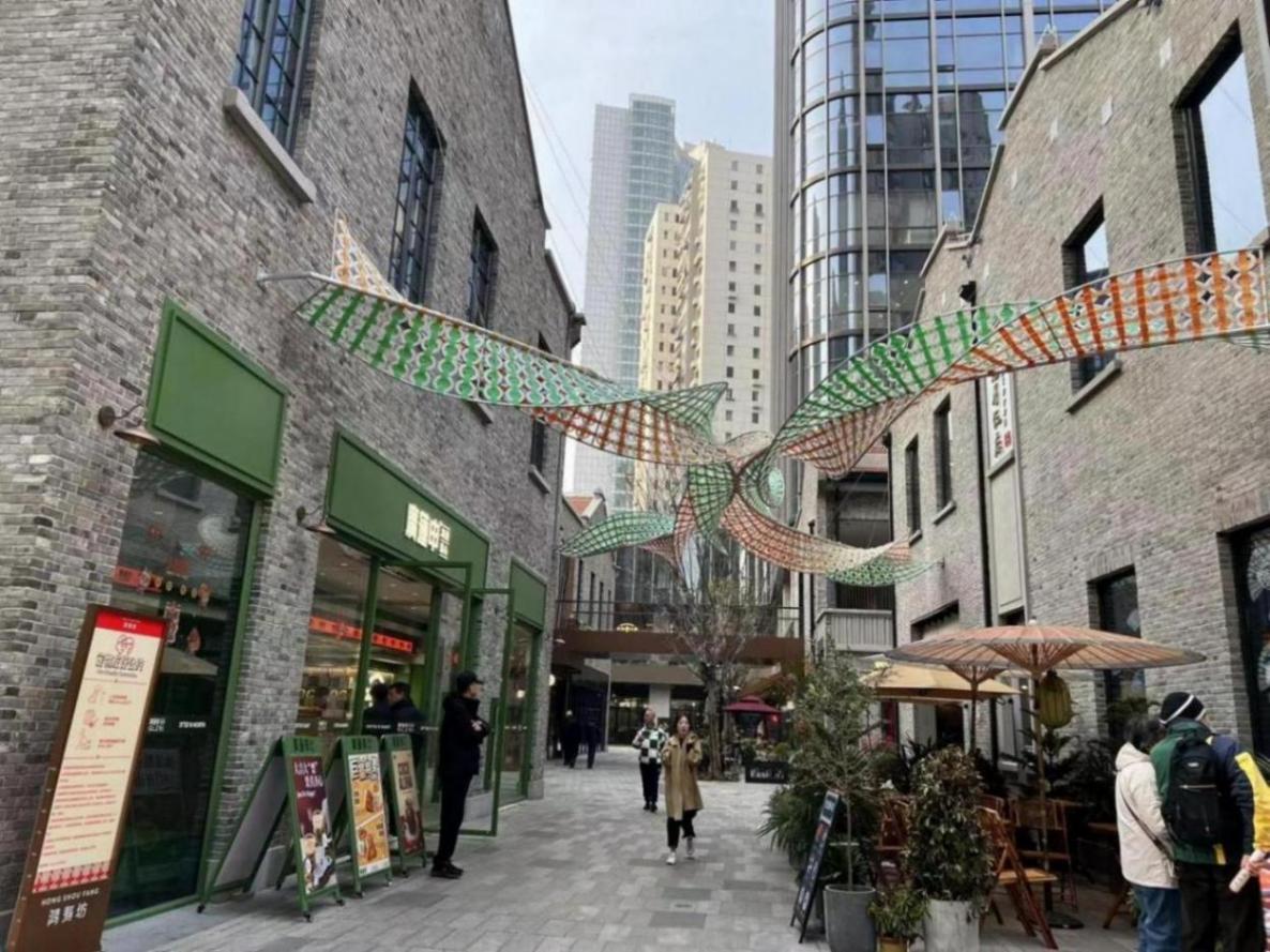 鴻壽坊的更新,將屬地文化特色發(fā)揮到極致,其采用“原址保護(hù)、整體復(fù)建、構(gòu)件再利用”的原則,最大限度保留文化要素。打個(gè)比方,采用1:1比例還原鴻壽坊舊址,典型的魚骨狀肌理與石庫門里弄結(jié)構(gòu)保留了上海街巷文化特色,大面積舊磚循環(huán)利用,并采用環(huán)保低能耗通風(fēng)天窗等建筑更新手段,匠心打造開合有致的里弄商業(yè)空間。主入口處的藝術(shù)裝置《上海點(diǎn)心》,以上海人熟悉的“油條”為靈感,展現(xiàn)了上海市民生活特色,而位于一側(cè)連廊內(nèi)的《金色拱廊》裝置,以螃蟹蒸籠為原型,將上海的煙火氣與市民生活溫度再次留存下來。