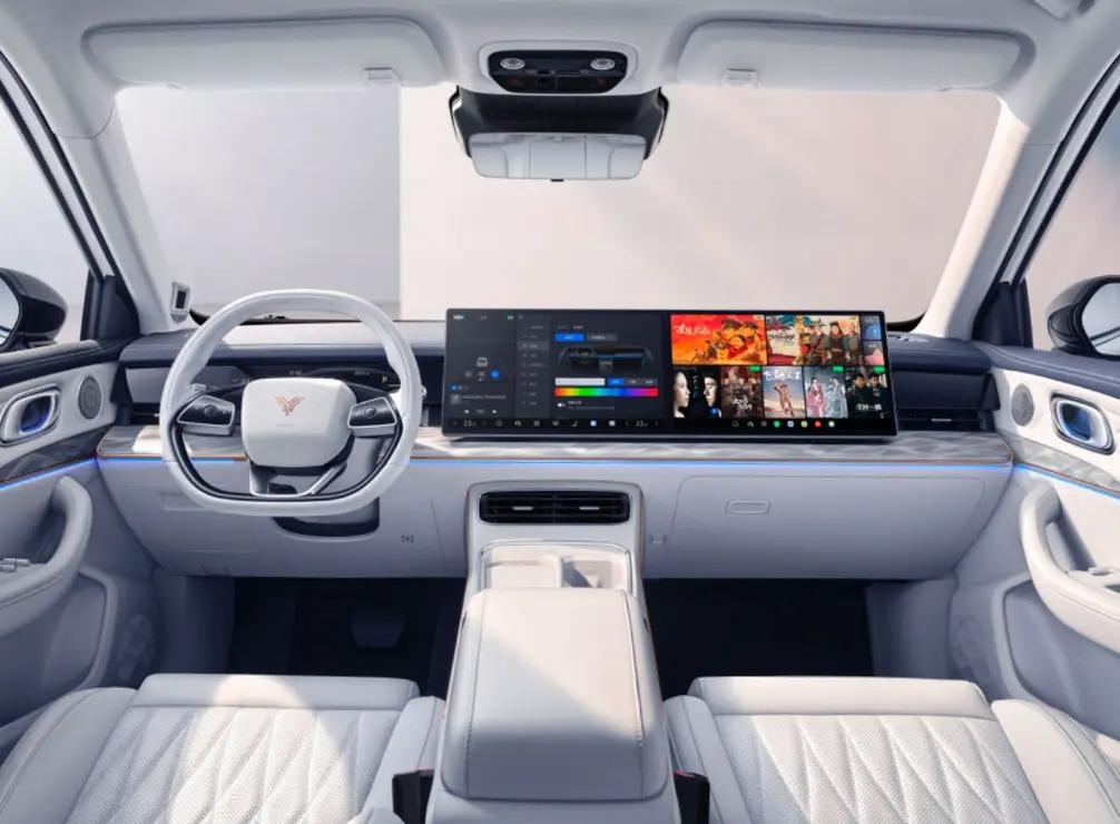 、大沙發的思路運用其中,全液晶儀表+雙15.6英寸的雙聯屏,擁有1920*1080 FHD全高清分辨率,布局和理想非常相似,內置了8155的高通驍龍芯片。