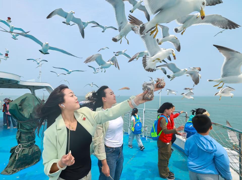 初夏的周末,榮成市海驢島海域,游客們登上游船感受海風習習,與黑尾鷗親密互動,盡享夏日休閑好時光。