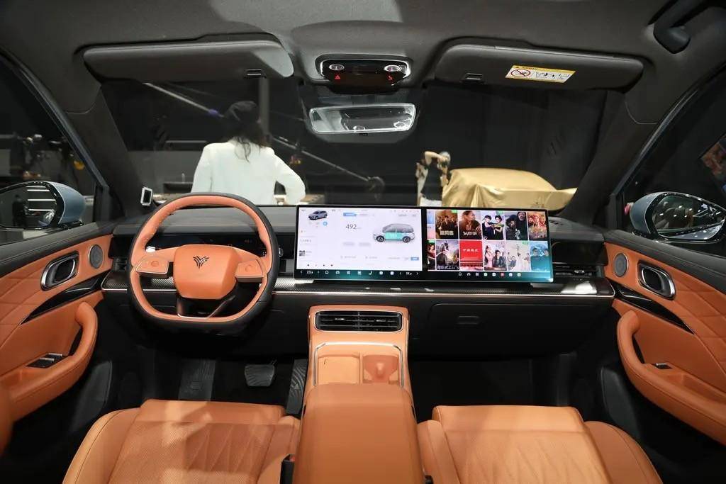 來到內飾部分,哪吒L純電版和增程版同樣是沒有區別的,它的車內是配備了嵌入式的全液晶儀表盤和中控屏+副駕駛娛樂屏組成的懸浮式雙聯屏,搭配上平底的三輻式多功能方向盤和懷擋式的換擋機構,科技感是做得十分出色的。另外,內飾的用料配置也是哪吒L比較注重的地方,車內使用了大面積的皮質材料進行包裹,還配備了車載冰箱和“大沙發”,帶給你更加溫馨的用車氛圍。