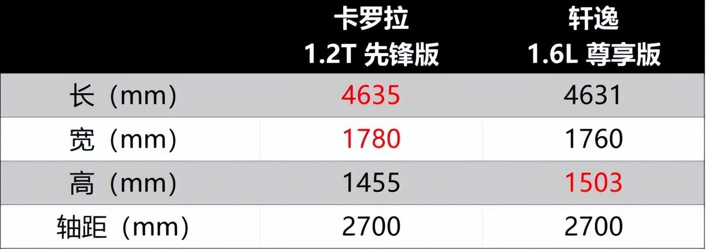 同為緊湊型轎車,卡羅拉和軒逸的車身尺寸差距極小。
