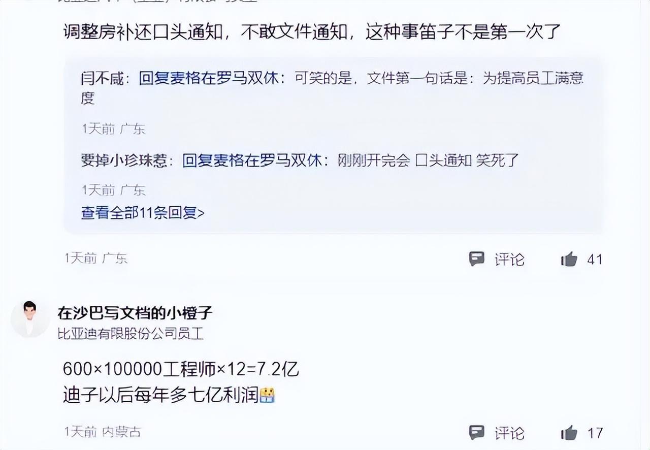 與此同時,比亞迪內部開始進一步降本。近日,比亞迪內部的一項決策引發了廣泛的討論——該公司決定下調員工的住房補貼,從原本的1000元降至400元。這一變化并未通過正式文件通知,而是以口頭形式傳達,其覆蓋范圍仍然是個謎。