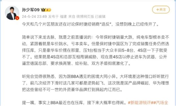 近日,有國內(nèi)媒體人報(bào)道,保時(shí)捷中國經(jīng)銷商集體“抗議”和“抵制”,準(zhǔn)備逼宮德國總部。矛盾的重點(diǎn)主要集中在保時(shí)捷銷量大跌,純電車賣不動(dòng),導(dǎo)致虧本賣車。而保時(shí)捷中國在此時(shí)為了完成自己的銷售任務(wù),仍然選擇壓庫,導(dǎo)致雙方矛盾激化。據(jù)報(bào)道,保時(shí)捷經(jīng)銷商目前以停止進(jìn)車為武器,要求保時(shí)捷總部給予補(bǔ)貼,并且更換高管。截止目前,保時(shí)捷官方尚未對(duì)此做出回復(fù)。