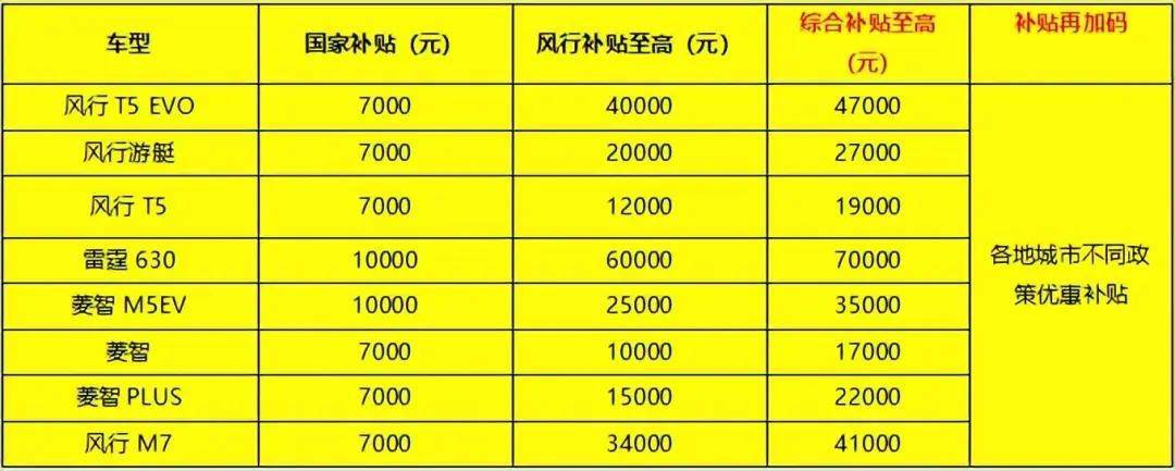 從補貼力度來看,東風風行旗下的雷霆630、風行T5 EVO、風行M7、菱智M5 EV等車型補貼都在萬元以上,而補貼最多的車型風行雷霆630綜合補貼至高超過7萬元。“以舊換新”情況下,國家給予1萬元補貼,風行則在國家補貼基礎上最高翻6倍,再補貼6萬元,結合各地城市不同政策,總計補貼至高超7萬元,對于消費者來說,省下來的這筆錢甚至都可以再買輛小型純電車了。