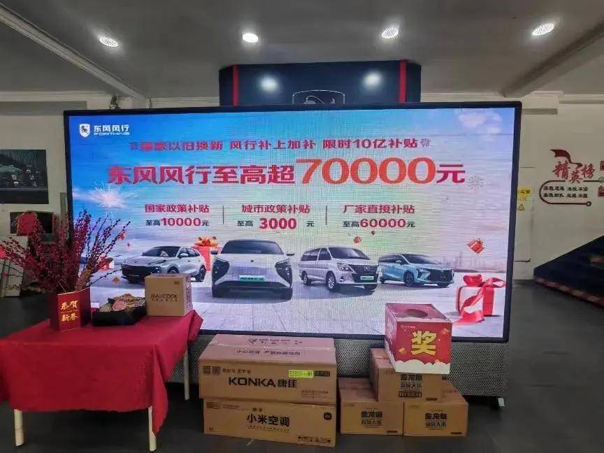 在東風風行4S店,消費者發現店端提供了豐富的獎品,優惠活動也有很強的吸引力。銷售人員一人帶著多組客戶,耐心詳細講解相關車型優勢和福利政策細則。所有符合規定補貼范圍的消費者,凡是活動期間購買風行新車的,只要“以舊換新”就能獲得三重補貼福利,一是國家政策補貼最高1萬元,二是風行最高補貼6萬元,另外還有各地城市不同政策優惠補貼,綜合補貼最高超7萬元。