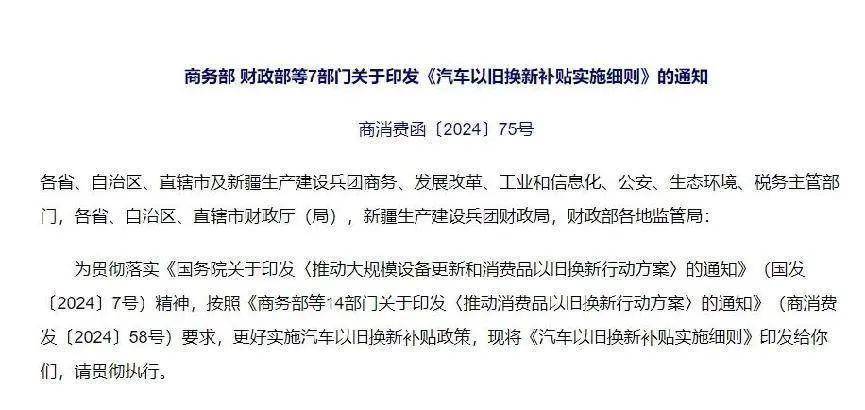 在商務部、財政部等7部門聯合印發的《汽車以舊換新補貼實施細則》中,明確提出2024年12月31日前,報廢國三及以下排放標準燃油乘用車或2018年4月30日前注冊登記的新能源乘用車,并購買符合節能要求乘用車新車的個人消費者,可享受一次性定額補貼。