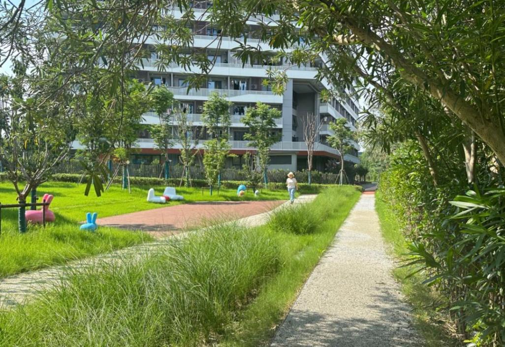 據悉,項目優化下墊面,采用透水鋪裝降低場地徑流系數,增加雨水下滲,實現社區內小雨不積水的效果,還能通過滲入透水鋪裝內部雨水的蒸發,緩解城市熱島效應;同時,利用植草溝收集、轉輸地表徑流,以自然形成或人工挖掘的淺凹綠地匯聚并轉輸來自地面的雨水,再通過植物、沙土的綜合作用凈化雨水,使之逐漸滲入土壤,達到涵養地下水的目的。