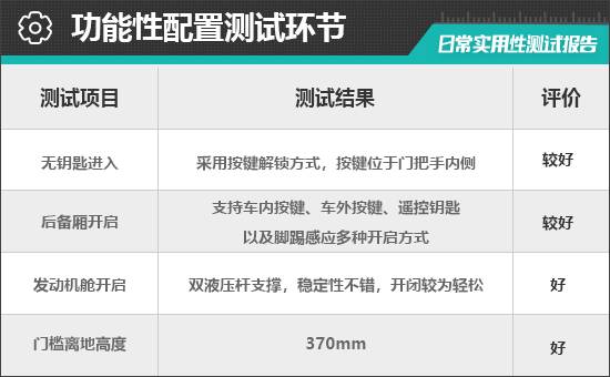 對于消費者來說,門檻離地高度一定程度上決定了上下車便利性。根據實測結果來看,評測車的門檻離地高度為370mm,成績優于此前測試過的同級別車型,駕乘人員日常上下車非常方便。