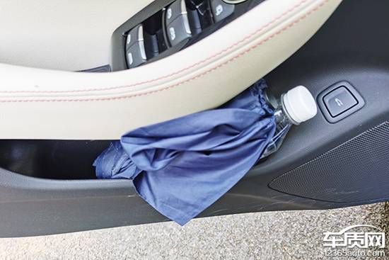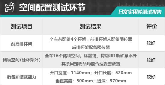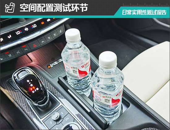 對于車內使用空間的測試,只針對前排觸手可及的空間,不包括手套箱、中央扶手箱等需開啟的空間。測試方法是將以下固定物品全部放置在前排的各個儲物空間內,通過固定物品的放置情況來判斷車輛儲物空間的表現。測試選定的固定物品為:2瓶常規大小的礦泉水、1部大屏手機、1支口紅、1個挎包、1副墨鏡、1把折疊雨傘以及1包常規尺寸的抽紙。