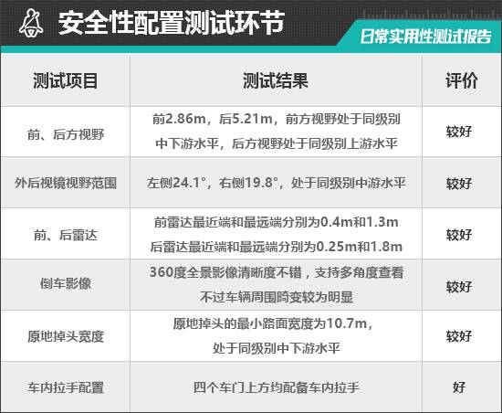 在車輛前、后方視野測試中,車內所有座椅均已調整至最低狀態,所測出的數據與駕駛者正常使用時均有一些偏差,僅供參考。