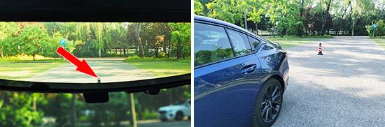 后方視野測試中,依舊將樁桶固定擺放,隨后移動車輛直至可以觀察到樁桶上沿為止。由于配備了流媒體后視鏡,因此評測車后方視野所測得的距離為5.21m,與測試過的同級車型相比處于上游水平,后方視野盲區較小。