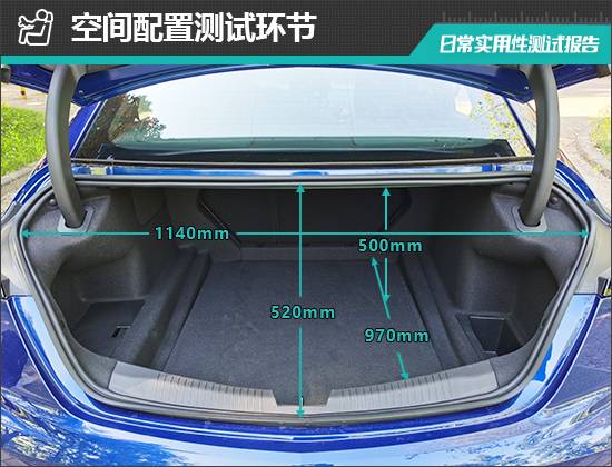 對于后備廂的基礎數值,我們也進行了實測,開口長度為520mm;開口寬度為1140mm;后備廂進深為970mm;后備廂地板與內部車頂的垂直高度為500mm。