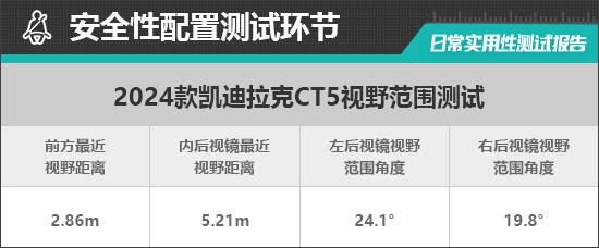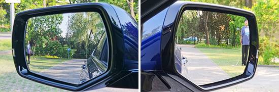 評測車的左側外后視鏡采用雙曲率鏡片,右側外后視鏡為普通鏡片。經實測,左側視野范圍為24.1°,右側視野范圍為19.8°,在測試過的同級別車型中均處于中游水平。