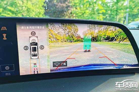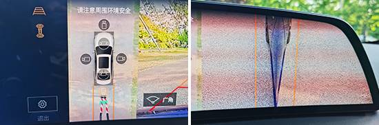 評測車配備了360度全景影像功能,支持多視角查看,并且提供了駐車輔助線。影像清晰度不錯,不過車輛周圍畸變較為明顯,會影響駕駛員對障礙物距離進行判斷,有待進一步優化。