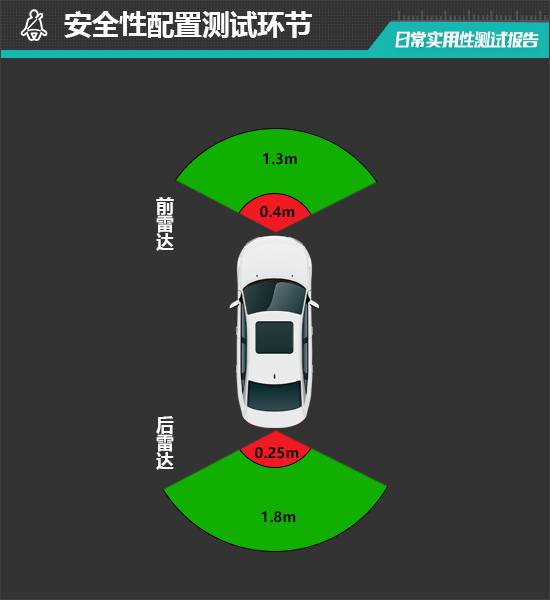雷達測試過程中,評測車的后雷達最遠可在1.8m處感應到后方物體,后雷達功率表現不錯。參考往期測試經驗,持續蜂鳴階段越接近0.25m則越貼近日常使用習慣,從實測數據來看,該車后雷達持續蜂鳴階段最遠距離為0.25m,與測試經驗值完全吻合。