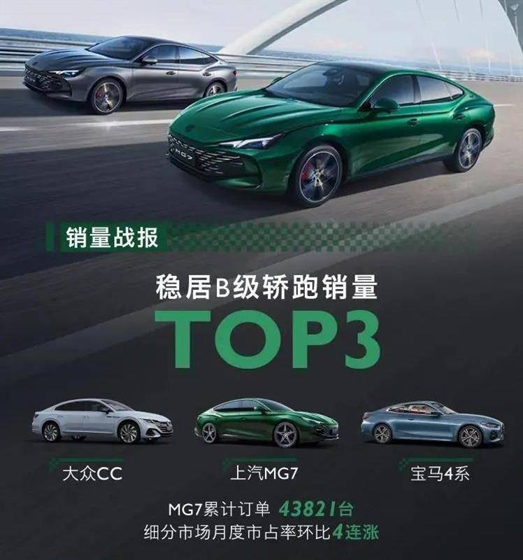 其中,另兩位分別是大眾CC和寶馬4系。可見,MG7憑借其“美學平權”“性能平權”“智能平權”“智駕平權”出色產品力打破了長期由合資品牌主導的市場格局。