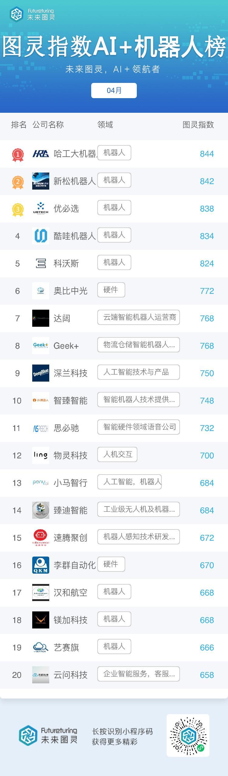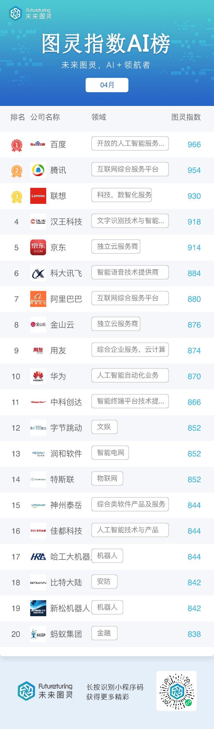 未來(lái)圖靈AI明星企業(yè)4月榜單出爐:百度、騰訊、聯(lián)想位居前3名