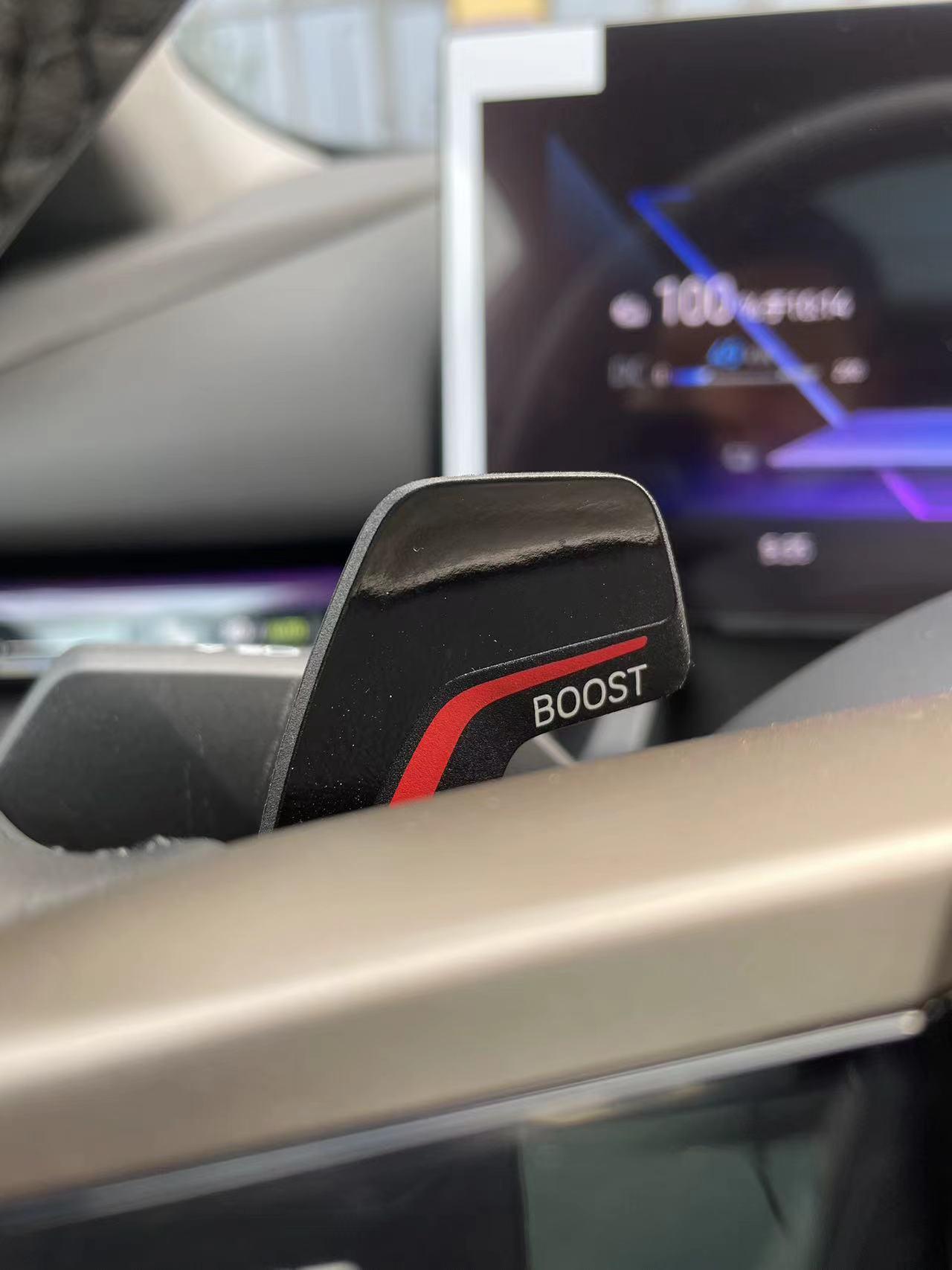 坐進車內,我首先注意到的是眼前的大方向盤,方向盤比較粗壯,手感還挺不錯,比較適合我的大手,上面還有個“BOOST”模式的撥片。