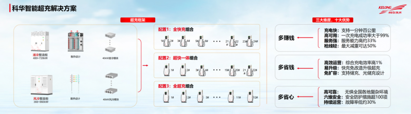 科華基于行業(yè)現(xiàn)狀及未來趨勢(shì),推出了720kW全液冷超充及960kW風(fēng)冷超充產(chǎn)品,具備“多賺錢、多省錢、多省心”三大維度十大特點(diǎn)。該系列產(chǎn)品適合所有超充場(chǎng)景,支持250A/400A風(fēng)冷超充與600A/800A液冷超充終端自由組合,最大可實(shí)現(xiàn)“充電1分鐘,續(xù)航100公里”。其中,400A風(fēng)冷超充終端可平替液冷超充,回本周期能縮短30%。