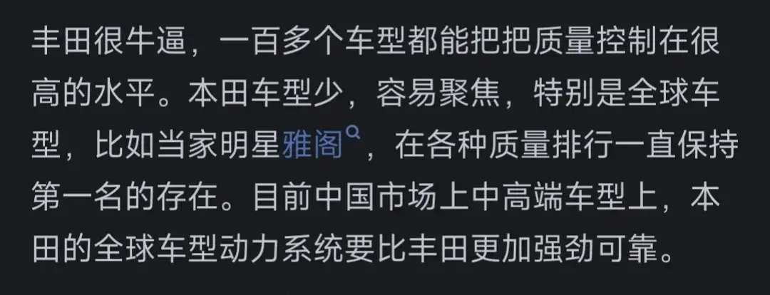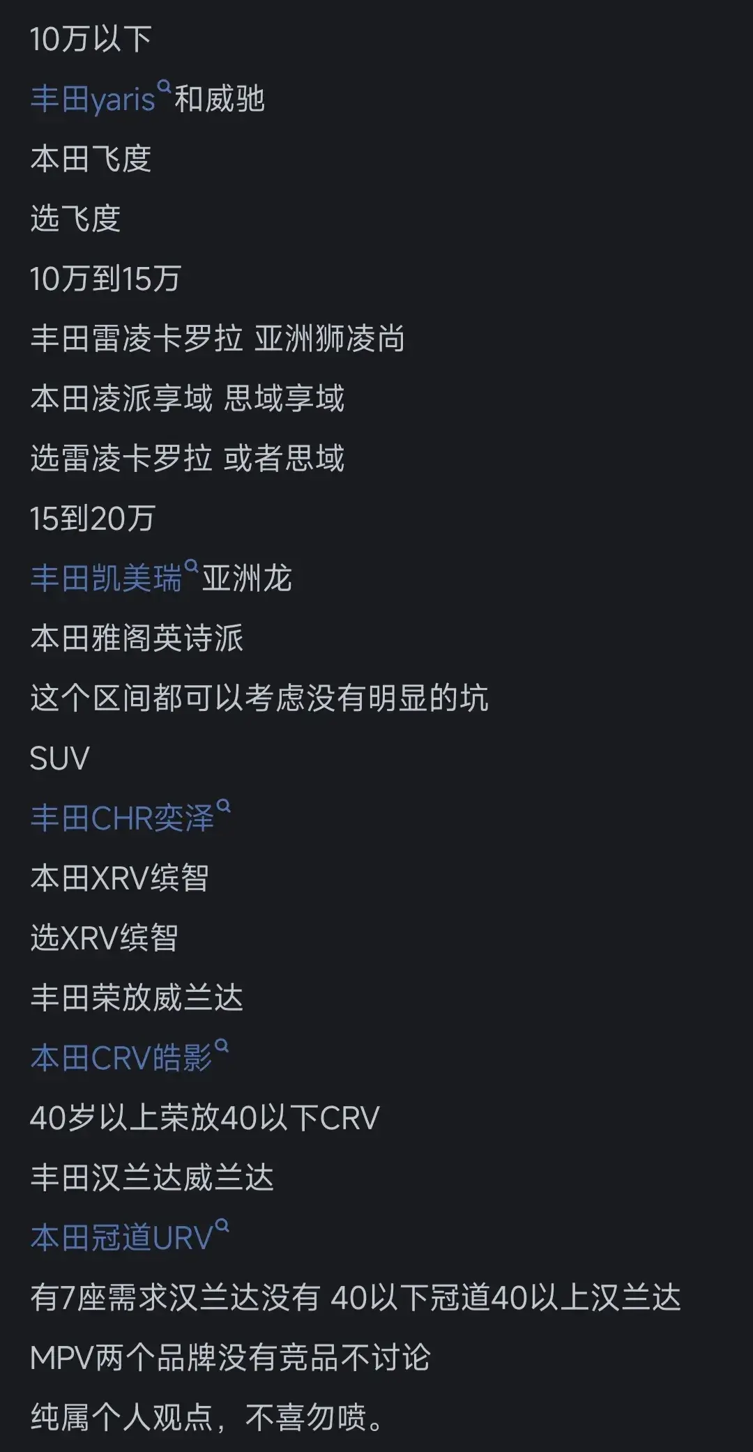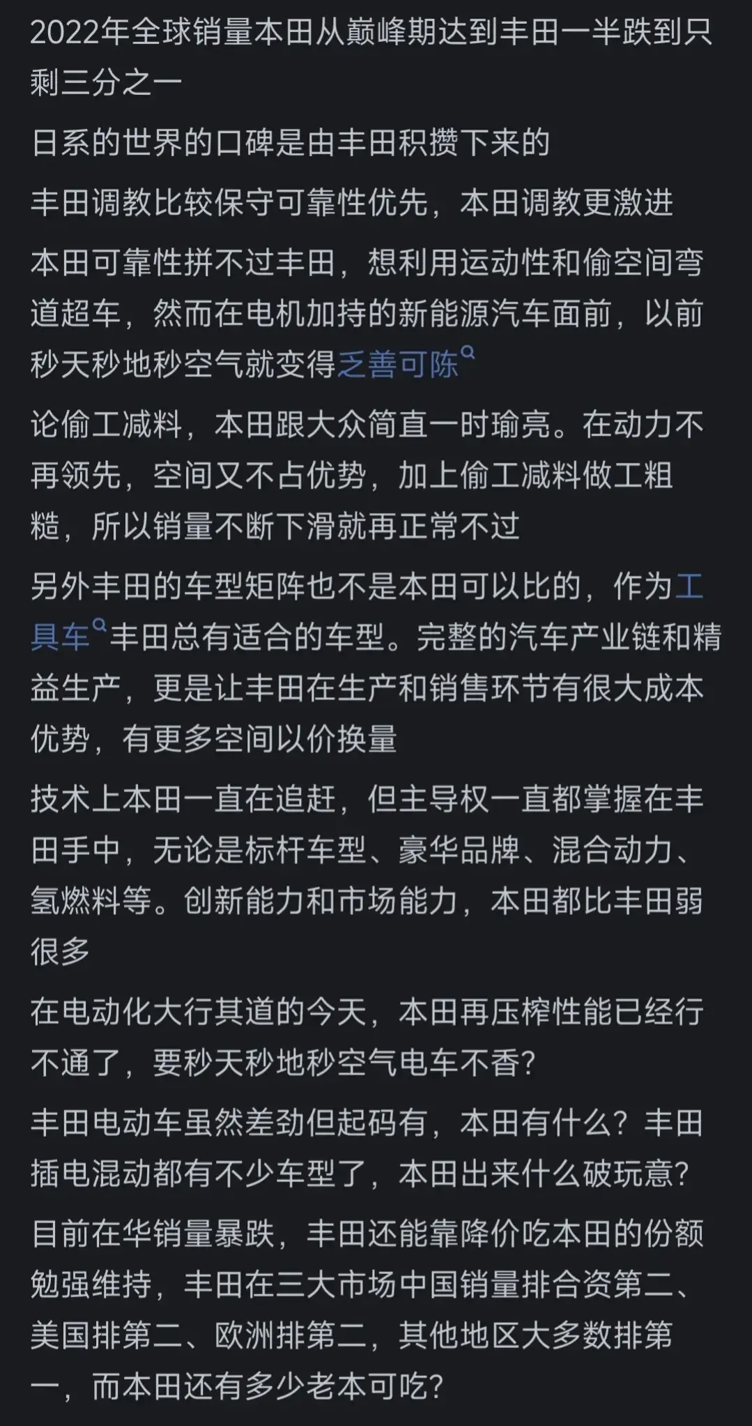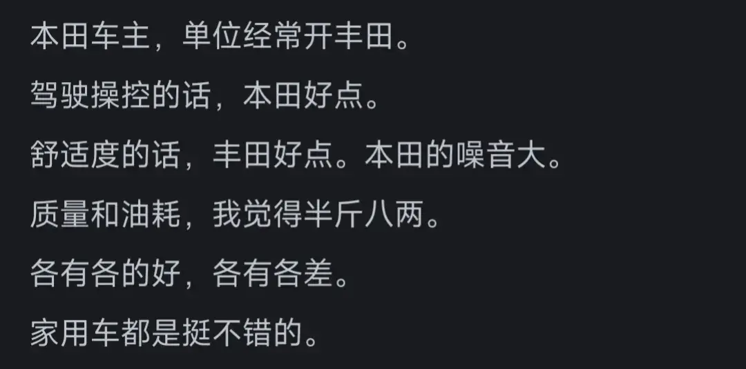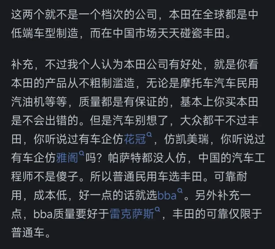 這位網友認為,本田和豐田不是一個量級的車,豐田普遍好于本田。本田在全球都是中低端制造,除了汽車,其他產品都不錯。而豐田的話,僅限于普通車可靠。