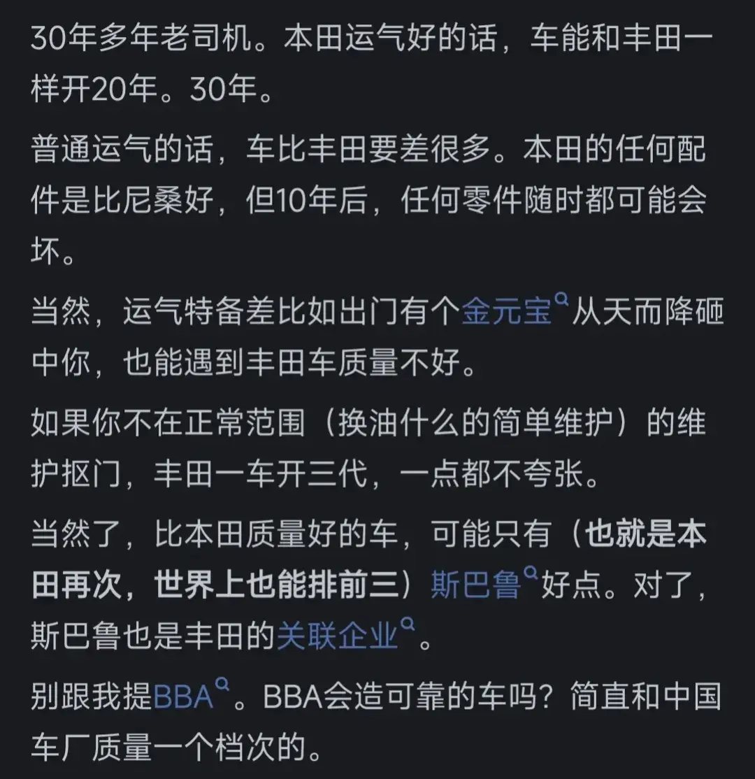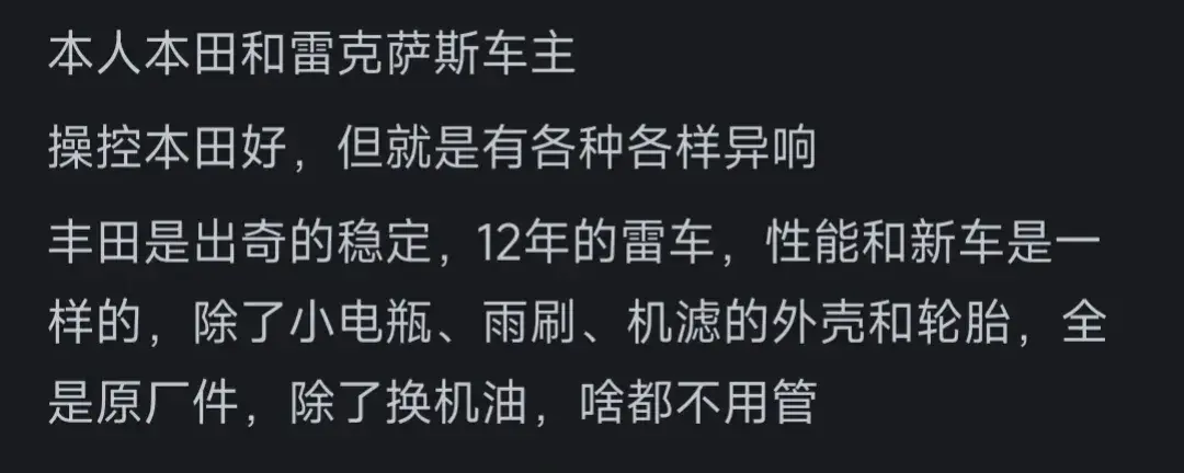 這位網友表達的意思是,豐田的質量一般情況下比本田好,但是十年后就可以看出區別了。