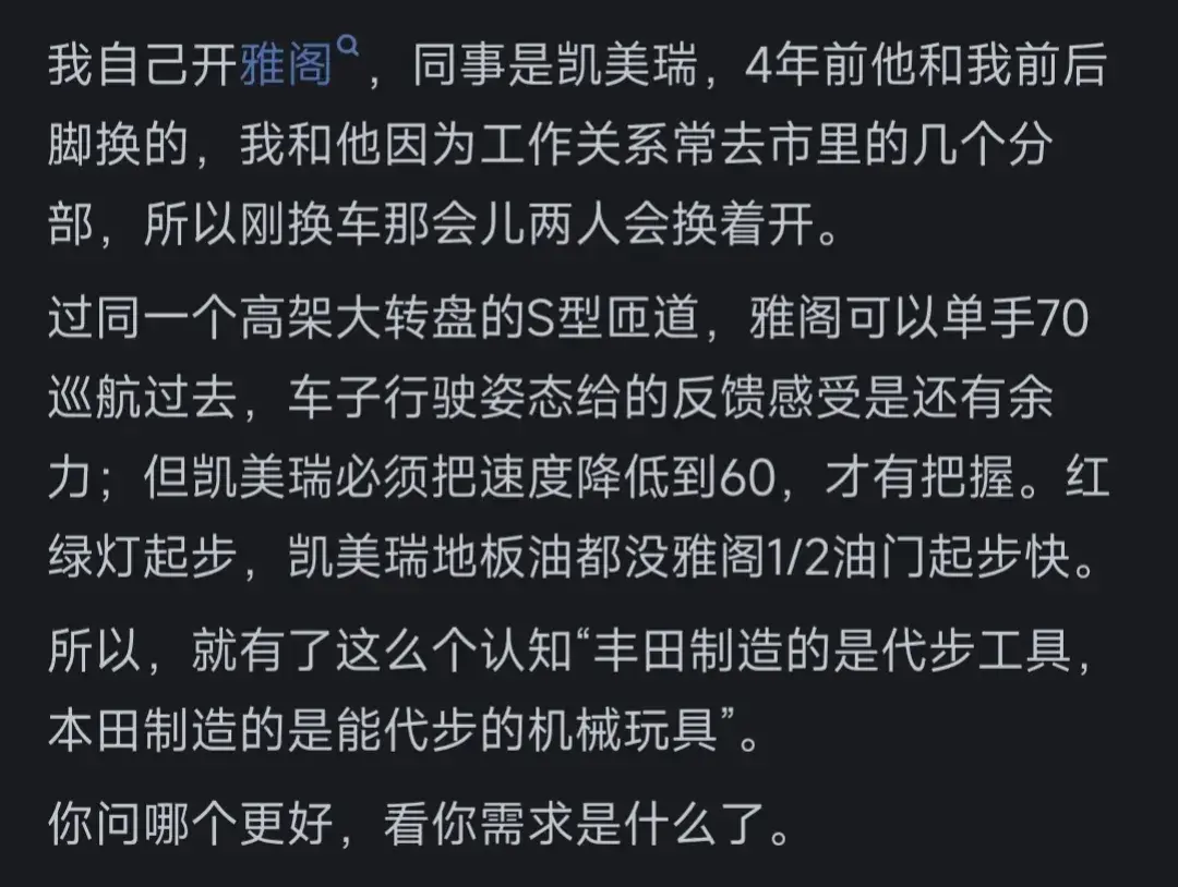 本田操控性好,豐田可靠性好。網友認為這兩個就是這樣的區別。