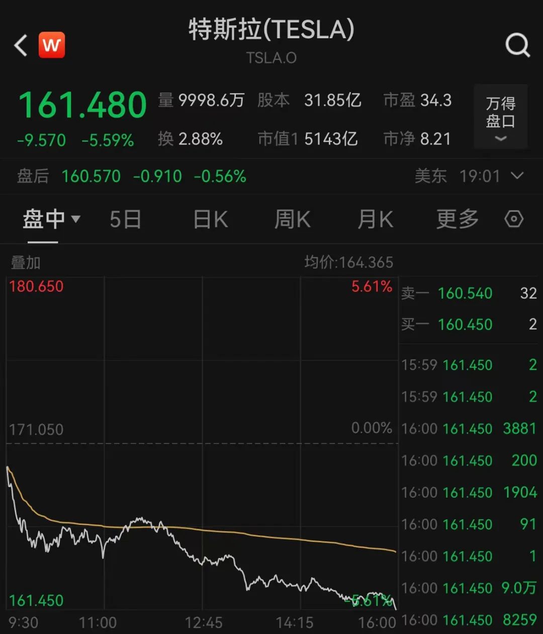 截至美股收盤,特斯拉跌5.59%,市值一夜蒸發(fā)305億美元(約合人民幣2214億元)。