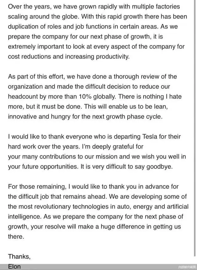 馬斯克說,經(jīng)過徹底審查,做出艱難的決定,將全球員工人數(shù)減少10%以上。他表示這將使公司保持精簡、創(chuàng)新并進(jìn)入下一個(gè)增長周期。