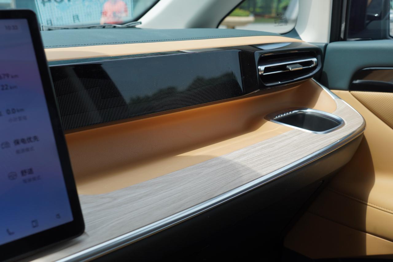 作為一臺定位在家用的MPV,還是重點來看內飾吧。E8的內飾很有意思,它整個中控臺和傳統的MPV,甚至和自家老大哥傳祺E9的設計都完全不同。E8的中控臺設計不像一個工業品,而更像一張木制的茶幾。在這張巨大的“茶幾”上,主副駕邊上都有一個很深的杯架。這個杯架可不只是擺設,實測一瓶900ml的大可樂都能穩穩放在里面。而且杯架不僅深度足夠,而且里面有固定裝置。不管是放咖啡,放保溫杯還是放其他飲料瓶,甚至是馬克杯都沒問題。