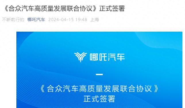 據哪吒汽車官微發布的文章,桐鄉市國有資本投資運營有限公司、南寧民生新能源產業投資合伙企業(有限合伙)、宜春市金合股權投資有限公司三方與合眾汽車(哪吒汽車運營主體)共同簽署《合眾汽車高質量發展聯合協議》。