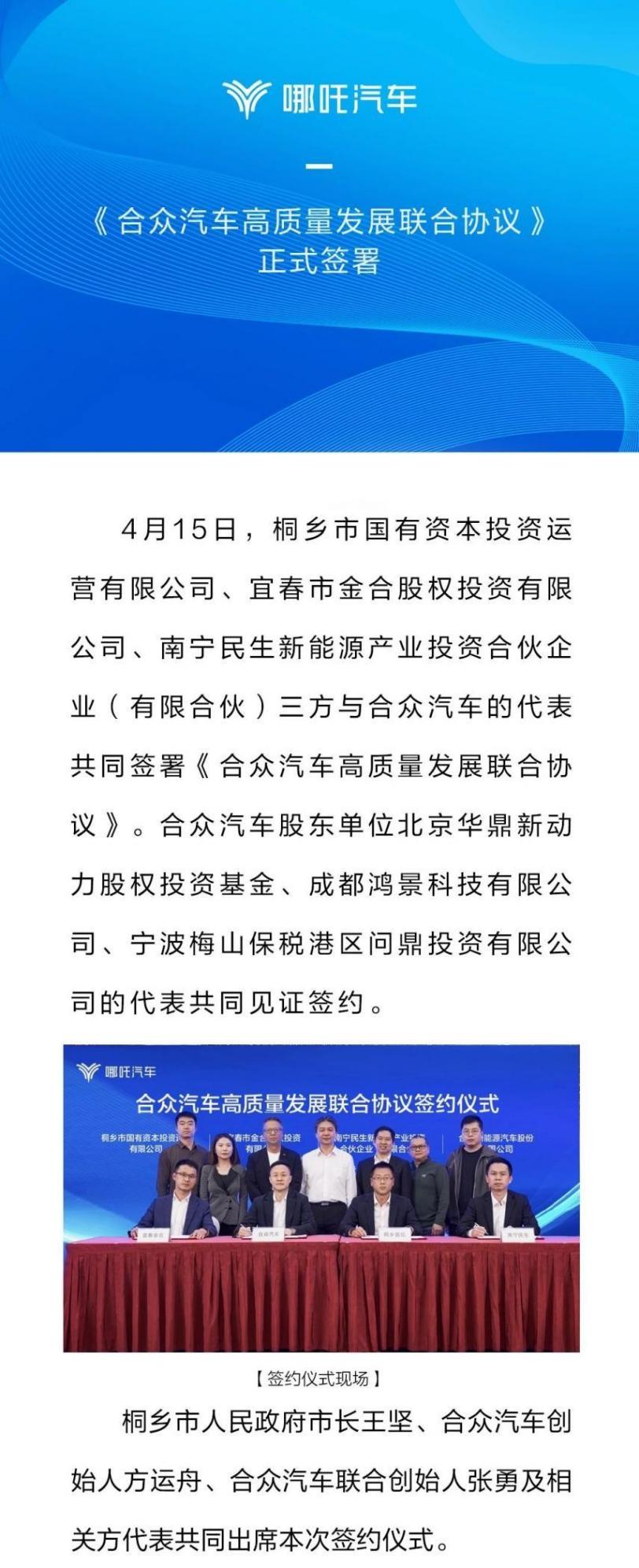 在與合眾汽車共同簽署的《合眾汽車高質(zhì)量發(fā)展聯(lián)合協(xié)議》中,桐鄉(xiāng)市國有資本投資運營有限公司、宜春市金合股權(quán)投資有限公司、南寧民生新能源產(chǎn)業(yè)投資合伙企業(yè)(有限合伙)三家簽約主體將向合眾汽車提供總額不少于50億元人民幣投資。此外,三家投資方還將會協(xié)調(diào)相關(guān)資源支持合眾汽車盡快實現(xiàn)IPO。