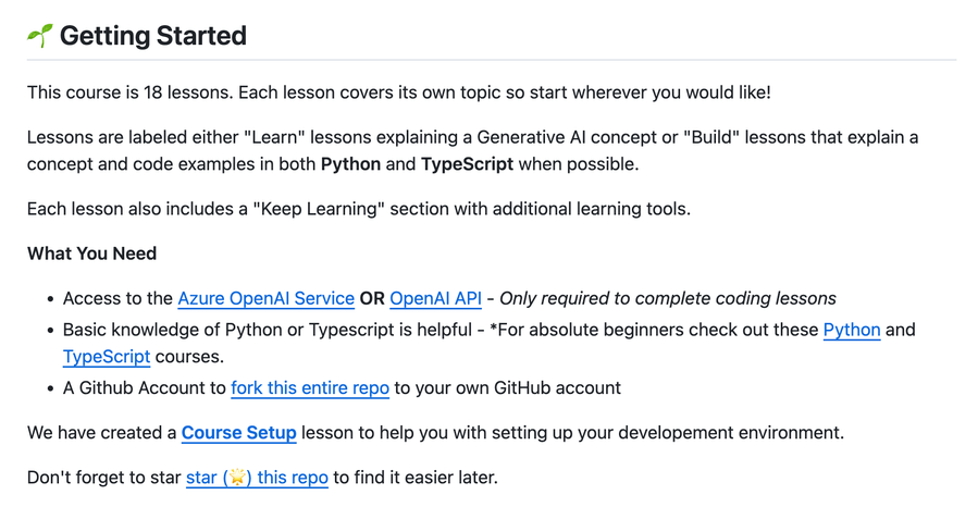 想要開始學習這個課程,只需要訪問 Azure OpenAI Service 或者 OpenAI API ,并有一定的 Python 或者 Typescript 的基礎知識。如果你是對這些完全不了解的初學者,也可以查看他們推薦的 Python 和 TypeScript 課程。除此之外,你還需要GitHub 賬戶以便于將這個項目整體 fork 到你自己的賬號下。
