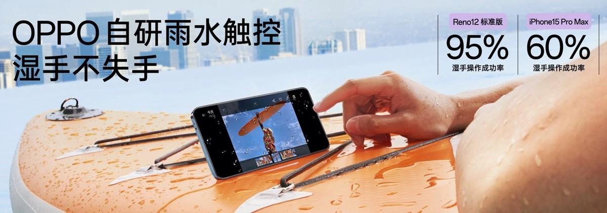 雨水觸控功能專為濕手、汗手等典型游戲場景下的觸控失靈而優化,在屏幕濺水、手粘汗水、屏幕凝結水汽等狀況下,Reno12 系列都可實現高精度、高成功率的觸控。配合 IP65 防塵防噴淋認證,Reno12 系列可隨時隨地,放心開玩。