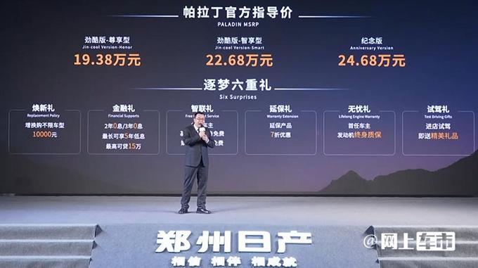 4月16日,鄭州日產(chǎn)帕拉丁勁酷版與紀(jì)念版正式上市,勁酷版官方指導(dǎo)價(jià)為19.38與22.68萬元,紀(jì)念版指導(dǎo)價(jià)為24.68萬元?,F(xiàn)購(gòu)車可享1萬元增換購(gòu)補(bǔ)貼等6重禮,優(yōu)惠后售18.38萬元-23.68萬元。