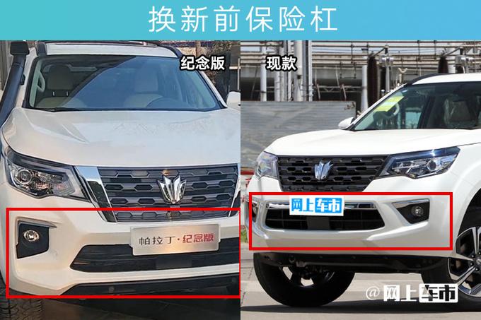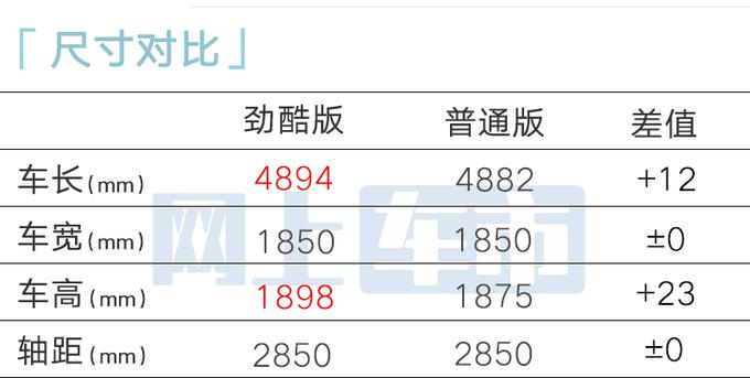 勁酷版/紀(jì)念版前臉換裝全新造型保險(xiǎn)杠,進(jìn)氣格柵加入鍍鉻飾條。勁酷版增加寬幅輪轂、外后視鏡投地?zé)籼骸Ⅴ忯~鰓裝飾件、行李架橫梁、副駕4向電動(dòng)調(diào)節(jié)、前泊車?yán)走_(dá)4個(gè)、前排座椅加熱/通風(fēng)、電動(dòng)側(cè)踏板、電動(dòng)尾門、后備箱電源220V(120W)。