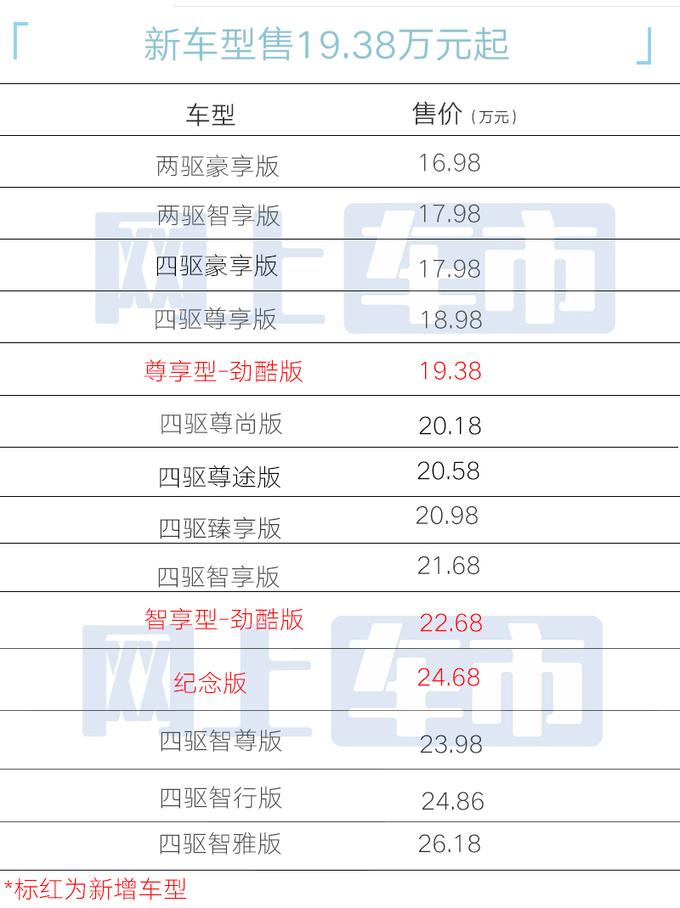 勁酷版在四驅(qū)尊享型與四驅(qū)智享型的基礎(chǔ)上增配,比其貴0.4萬元與1萬元;紀(jì)念版比四驅(qū)智享版貴3萬元,增加原廠越野套件。