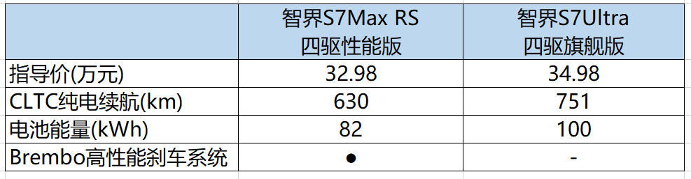 最后是新增的頂配Ultra四驅(qū)旗艦版,售價位34.98萬,價格增加了2萬元。這一配置電池電量又回到了100kWh,所以CLTC續(xù)航也達(dá)到了751km。其它配置方面跟Max RS四驅(qū)性能版沒有變化,但少了Brembo高性能剎車系統(tǒng)。因此筆者認(rèn)為在擁有15分鐘補(bǔ)能430km的快充情況下,多花2萬元來提升121km續(xù)航并不是太劃算。