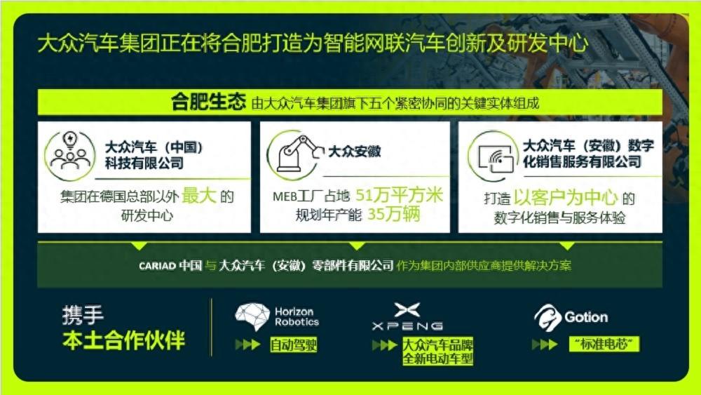 大眾安徽(原江淮大眾)與上汽大眾、一汽-大眾不同,重心完全放在新能源方面,也是大眾在國內第一家專注于新能源汽車的合資企業,目前已建成的工廠主要用于生產較為成熟的MEB平臺車型,規劃年產能35萬臺。