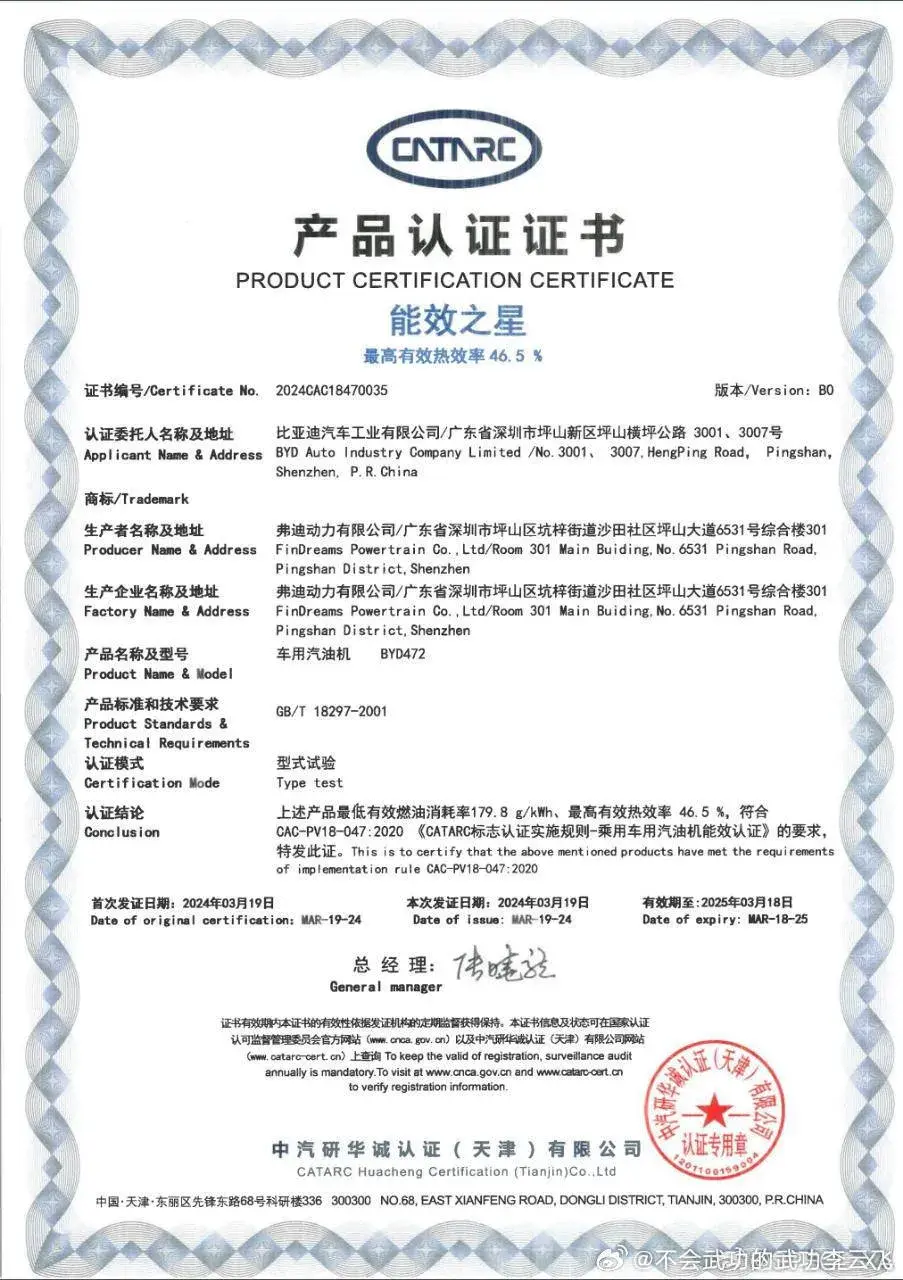 比亞迪的品牌及公關處總經理李云飛接話了。他連說了三個“量產”。言外之意我們說的是量產車型第一,你吉利這個發動機還沒上市。他曬出一張同樣是中汽研發的證書,熱效率46.5%,“像這種沒量產的,更高熱效率的,我們還有大把,只是不想說而已!”。