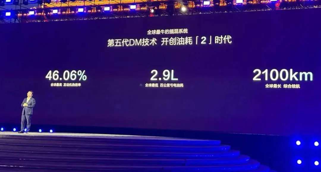 會上,比亞迪領導說他們第五代DM-I的車子油耗進入了“2時代”。這張圖在網絡上流傳很廣,大意是,我們的車子續航超過了2100多公里,油耗在3L之內,我們的發動機熱效率46.06%,全球第一。