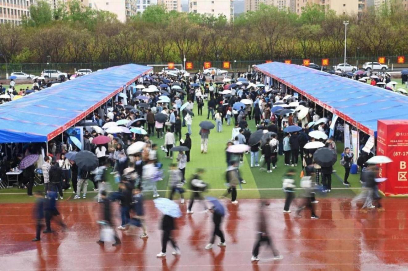 2024年4月20日,甘肅蘭州,工學類院校(學科專業)聯盟2024屆畢業生春季雙選會暨蘭州理工大學“宏志助航計劃”招聘會,畢業生冒雨參加雙選會。 中新社記者 李亞龍 攝