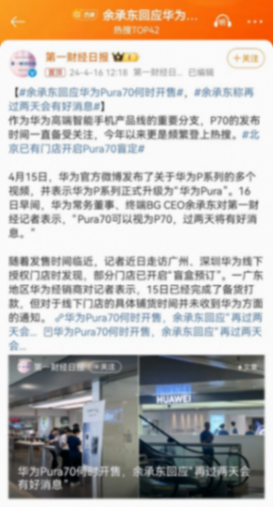 今天,#余承東回應華為Pura70何時開售# 這一話題出現在了熱搜榜單上。來自第一財經日報的報道顯示:“16日早間,華為常務董事、終端BG CEO余承東對第一財經記者表示,‘Pura70可以視為P70,過兩天將有好消息。’”