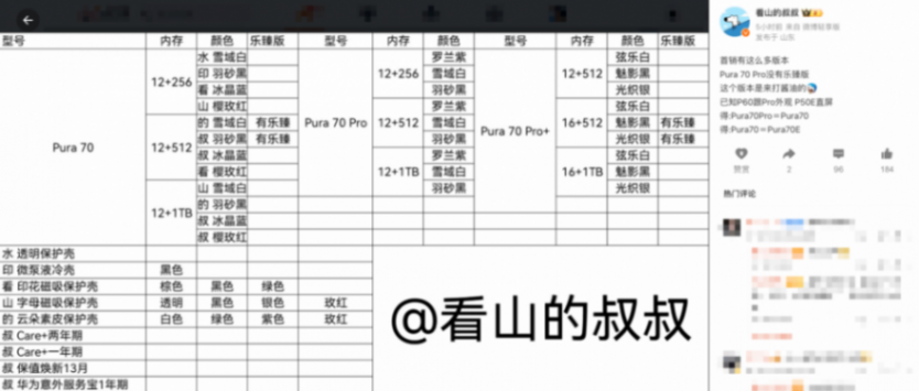 博主@看山的叔叔 在最新的一份爆料中也提到了這一代新機的更多信息:“首銷有這么多版本,Pura 70 Pro沒有樂臻版,這個版本是來打醬油的,已知P60跟Pro外觀 P50E直屏,得:Pura70Pro=Pura70,得:Pura70=Pura70E”。