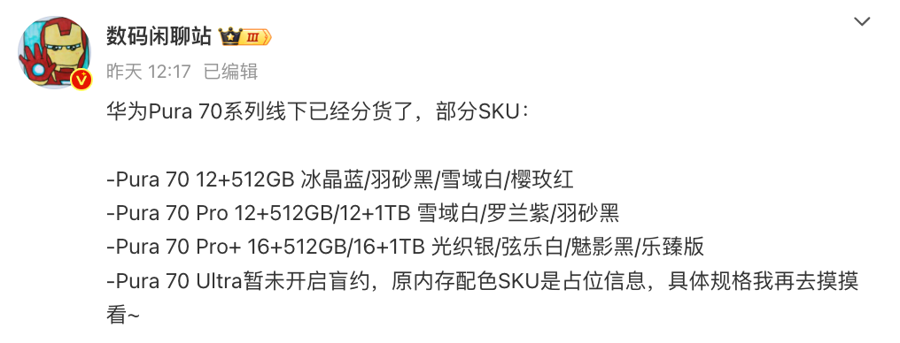 而在更早之前,博主@數碼閑聊站 的一份爆料也透露了全新華為Pura 70系列的完整陣容:“華為Pura 70系列線下已經分貨了,部分SKU:-Pura 70 12+512GB 冰晶藍/羽砂黑/雪域白/櫻玫紅 -Pura 70 Pro 12+512GB/12+1TB 雪域白/羅蘭紫/羽砂黑 -Pura 70 Pro+ 16+512GB/16+1TB 光織銀/弦樂白/魅影黑/樂臻版 -Pura 70 Ultra暫未開啟盲約,原內存配色SKU是占位信息,具體規格我再去摸摸看~”